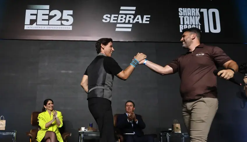 No último dia da Feira do Empreendedor 2025 (FE25), três empresas atendidas pelo Sebrae-SP enfrentaram os “tubarões” do Shark Tank. A Arena do Conhecimento, espaço na FE25 dedicado a receber as principais palestras do evento, foi palco de uma reprodução do programa em que os donos de negócios apresentaram seus pitches para a bancada do reality show, formada por Caito Maia, fundador da marca de óculos Chilli Beans; Carol Paiffer, CEO da Atom; José Carlos Semenzato, fundador da SMZTO Holding de Franquias; e a empresária Camila Farani, que participou como convidada.